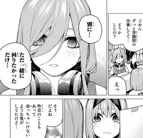 場面変わって、パンケーキの売り子をしている五月と二乃です。学園祭が終わった後で、風太郎が誰を選ぶかと言う話をしています。二乃からあんたが選ばれる可能性もあるのよ、と言われ動揺する五月です。また、たこ焼き屋をやっている描写がなく、二乃が「さーねー どうなるのかしら…」と五月に意味深な事を言っている辺り、男子組がやっていたたこ焼き屋に何かあったのかもしれません。