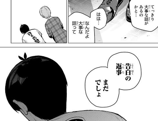 一花はそれだけ?と思わず言ってしまいます。そして告白の返事まだでしょと言い、風太郎にイエスでもノーでも先延ばしすればするほど酷だよ、と一花は忠告します。その時、迷子になっている男の子を見つけ、一花と風太郎は男の子の母親を一緒に探します。