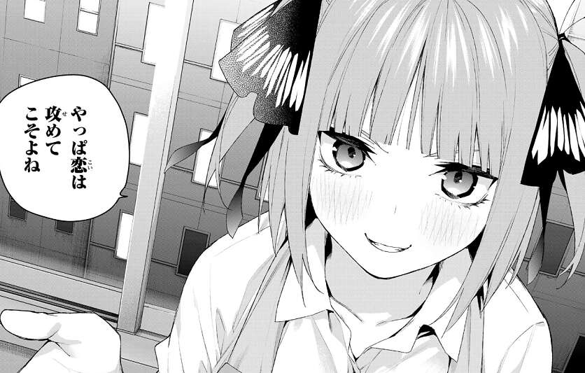 やっぱ恋は攻めてこそよね、と不敵な笑みを浮かべながら二乃は風太郎に言います。
