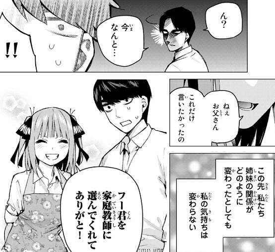 が、この計画が風太郎の計画と知り、家庭教師の範疇を超えていると途端に不機嫌になります。しかし、それが私に出来なかったことだと言い、風太郎に家庭教師を頼んでよかったと心から思うと父親に言ってもらえます。そして親として、風太郎が娘たちとの関係を真剣に考えてくれることを願うと言われます。