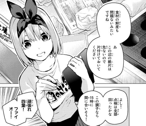 翌日の二日目、四葉は開場の三時間前から出てきてなんでもしますと、さらにお仕事を手伝おうとします。新しいパンフレットを運んだあと少し無理をしているような表情をする四葉ですが、三玖から大丈夫か心配されても、三玖より少しだけ力持ちだからね、へーき へーきと軽口で応えます。
