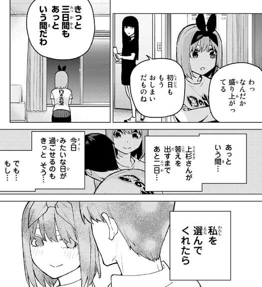 四葉は初日の後の演劇部の稽古の合間に窓から学園祭の様子を眺めていますが、最終日に風太郎が五人の中から誰かを選ぶと言った事を思い出し、つい私を選んでくれたらと考えてしまいます。その直後、たこ焼き屋が家事を起こした事を知ります。