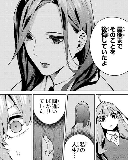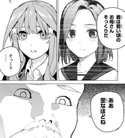 母親も学校の先生だったと付け加えると、自分は五つ子たちの母親の担任教師だったと無堂は打ち明けます。そして五月が若い頃の母親に歪なほどそっくりだ、五月がお母さんの後を追っているだけならお薦めしないと無堂は忠告します。
