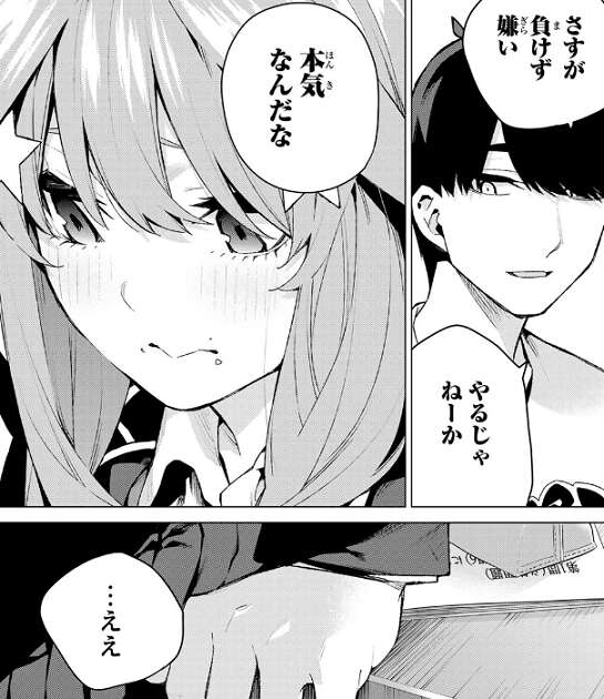 場面変わって学園祭初日、風太郎は五月が学祭中でも一人で自習をしていると聞いて、勉強ばっかで大丈夫か、学校つまんねーなら相談に乗るぞと、五月を心配します。いつも一人で勉強ばかりしていた風太郎に言われたくないと、五月は言い返します。風太郎は五月が勉強を頑張っているのに、成果が出ない事を不思議がっていると、負けず嫌いの五月はかなりの量の問題集をさらにこなそうとします。