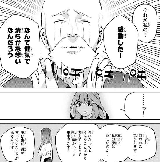 二乃にも心配され二乃は五月に食べ物を奢ろうとしますが、五月は全てを終わらせるまで邪念は断つと食べ物を断ります。五月は教師という夢は分不相応な目標だったのでしょうか、とつい弱気になってしまいますが、二乃からは学校の先生なんて立派な夢だと、五月の夢を応援していると励まされます。二乃は父親に招待状を送った話をし、こういう時に道標になってくれるのが親の役目だと言います。