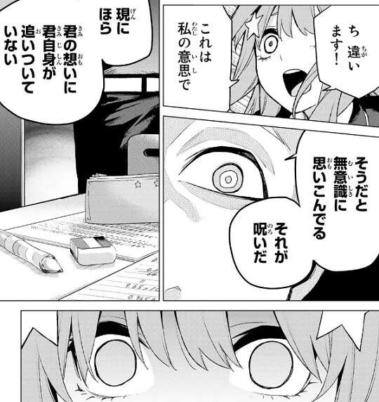 五月は自分の意思だと言おうとしますが、そうだと無意識に思い込んでいる、それが呪いだと言い、五月の想いに五月自身が追いついていないと、五月が勉強をしても成果が出ていない事を指摘します。無堂の言葉にショックを受け、言葉を失う五月です。