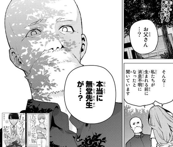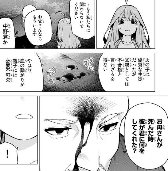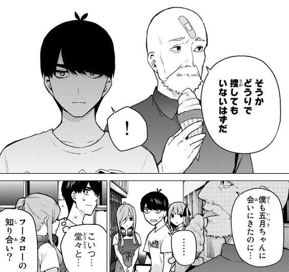 今からでも罪滅ぼしをさせてほしい、父親として娘に出来ることをしたいと言う無堂に対し、既にお父さんならいると私たちに関わらないように五月は言います。しかし、中野は父親としては不合格だと無堂は言い、血の繋がりが親子には必要不可欠だと五月に言います。さらに母親が死んだ時、中野が五つ子たちに、五月に何をしてくれた?質問します。