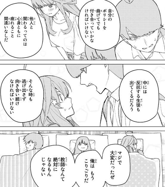 風太郎は生徒と逃げ出さず向き合い続けなければいけない教師なんて絶対になるもんじゃないと言いつつも、自分の夢ならどれだけ逆風だろうと、進も諦めるも自分で決めろと五月に言います。それを聞いた五月は泣きながら、教師になるのが本当に自分の夢なのでしょうか、ただ母親になりたいだけではないかと、疑問を口にします。