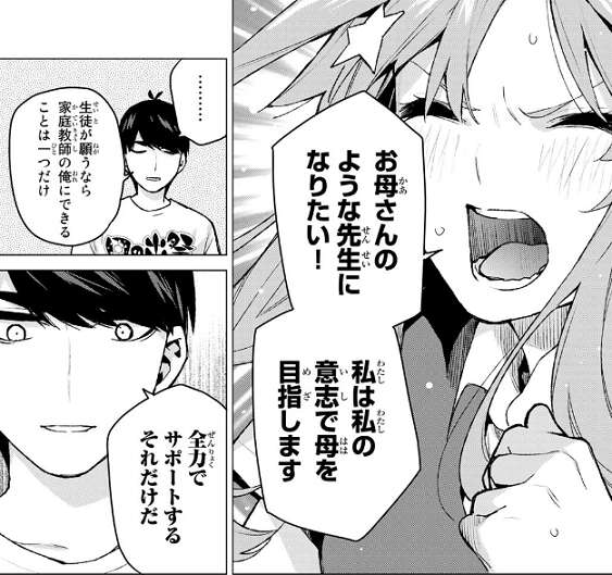 五月が先生になりたいと願うなら、家庭教師として全力でサポートすると風太郎は五月に言います。すると五月は風太郎に勉強を教わることを嫌がっていた以前までとは違い、素直に勉強を教えて欲しいと風太郎にお願いします。勿論だと快諾する風太郎です。