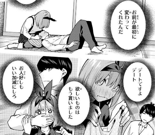 ついに四葉に告白した風太郎ですが、四葉の性格からか最初は他の姉妹の方がいいと言うような事をいって断ってきます。さらに風太郎から逃亡してしまいますが、五月のアドバイスもあり、再度風太郎が告白し四葉も正直な気持ちを告白します。