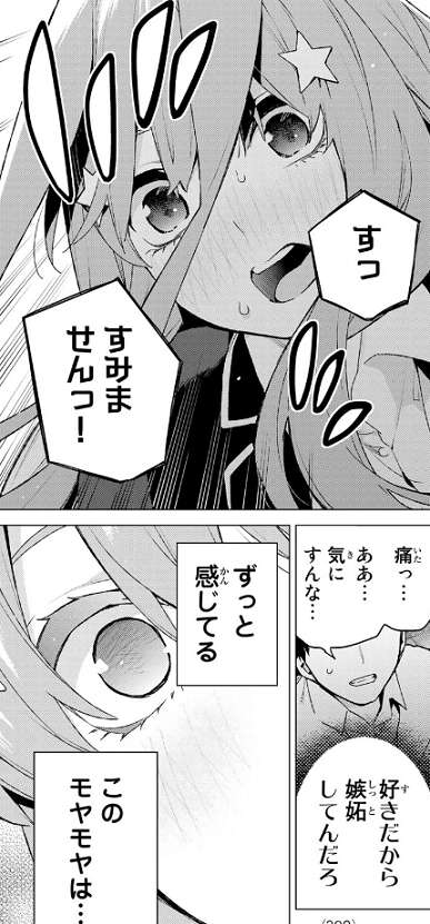 今まで恋愛描写が少なかった五月ですが、下田への悩み相談からモヤモヤしているのは男が好きだからと言われて、風太郎を意識し始めます。今さら引っ掻き回すような真似はしないと決意しますが、その後風太郎と、四葉と、二乃と会ってしまい、五月の思惑とは逆方向に進んでしまいます。四葉に対しての二乃の厳しい言葉で、四人が話していた進路の話は強制的に終了となり、最後は四葉と二乃の話し合いを風太郎と聞いてしまう形になります。五月や風太郎がいることがバレれば、さらに衝突してしまいそうです。