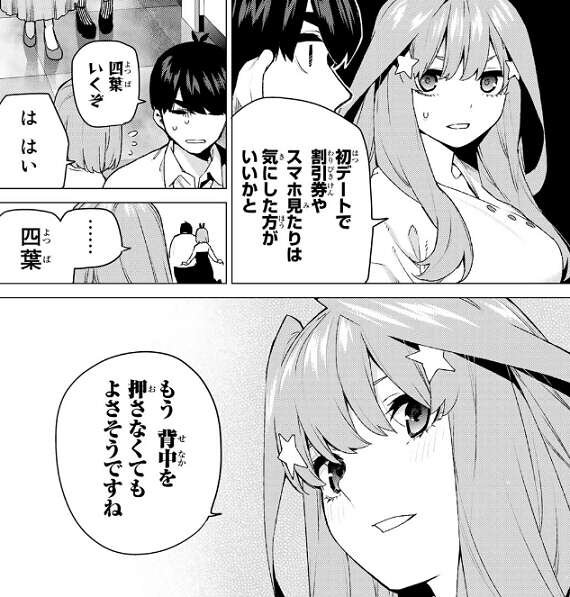 二乃をなだめるため五月も二人の前に現れますが、風太郎と四葉はいつからいたのかと驚きます。五月は風太郎に割引券やスマホの件を注意すると、風太郎たちは別の場所に向かいます。五月は四葉を見ながら、もう背中をおさなくてもよさそうですね、と笑顔で2人を見送ります。