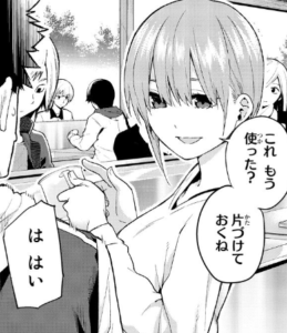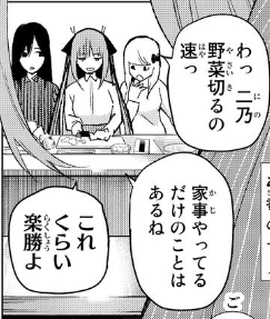 二乃は男子に指示を出したり得意の料理スキルで発揮したり、班のまとめ役です。