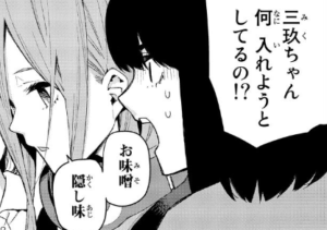 風太郎と四葉で驚かせている所に、一花と三玖のペアが来ます。そしてこの後、三玖が意味ありげに一花に問いかけます。一花どう返すのですかね?キャンプファイアーのダンスでひと波乱ありそうです。