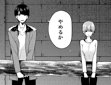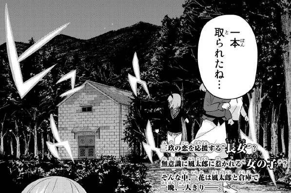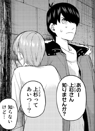 「一本取られたね」と言っていますが、閉じ込められてしまいました。ここで四葉が振り返ってしますが、何か見えたか聞こえたかした可能性ありますね。次回以降、風太郎たち脱出の手助けになるかも。