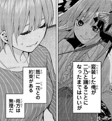 ただし風太郎は困ります。一花と二乃、二人とフォークダンスで踊るのは無理があります。