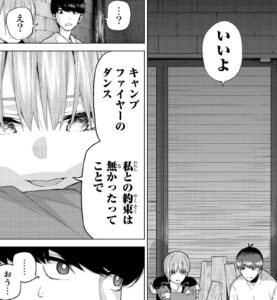 一花はキャンプファイヤーの約束は無かったことでいいよと言います。これで二乃との約束を優先することが出来そうですが、本当に一花の方の約束を破っていいのか?後三玖にはなんて言い訳するのでしょうか。