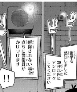 木材が倒れそうになった衝撃で作動したのか、防犯センサーが反応します。解除されないと警備員が来て、冒頭で話していた通り林間学校が台無しになります。キャンプファイヤーどころの騒ぎじゃないです。すぐ逃げないといけません。