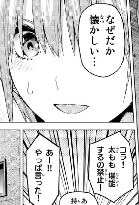 「懐かしい」とは12話の夏祭りの膝枕の事が無意識に蘇っているのでしょうか。あの時は、風太郎は熟睡していたので、記憶に残っていないはずですが。。。詳しくは2巻に夏祭り篇が収録されているので、気になる方は確認してみてください。