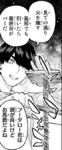 一花は、頭は良いけどお馬鹿だよねと皮肉ります。火をおこすのはいいですが、このな方法だと後何時間かかるかわかりません。それに室内で火を起こすのは危険です!と思っていたら、数ページ先でフラグが回収される展開になります。