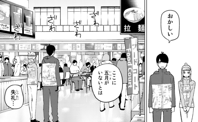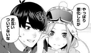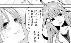 ここで風太郎が五月らしき人物を見つけます。真下を滑っている女子を指します。一花はその人物を見て似ているような違うような、とあいまいな返事をします。しかし風太郎が指していた人物は実は、男でした。風太郎はマスクをしていた一花が五月だと、実は気づいていたのです。
