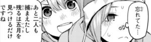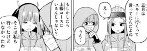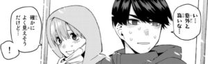 今回の話は三玖の悩みが晴れる二時間前の話です。一花を看病している五月ですが、旅館や倉庫で見た風太郎の怪しい行動に、五月はずっと警戒しているようです。