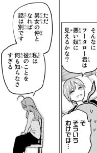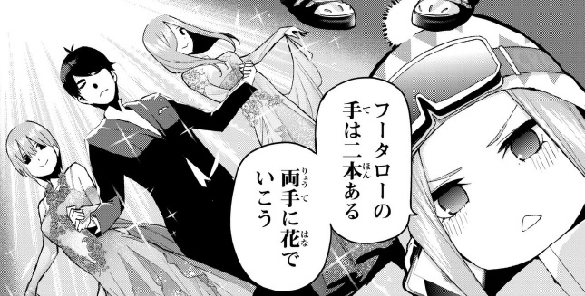 五月は風太郎が男として信用に足るのか、見極めないといけないと言います。ここで一花が「フータロー君はお父さんとは違うよ」と言っていますが、五月とお父さんの間で何かあった事を暗に示しています。