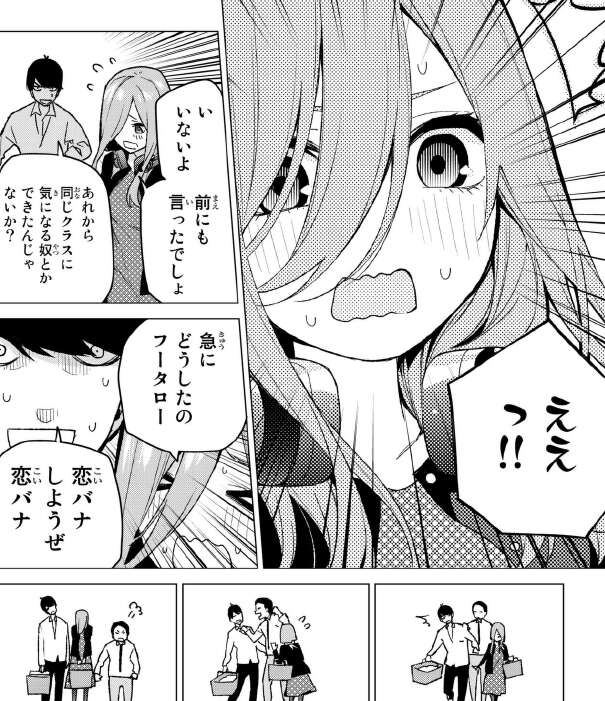 動揺し好きな人はいないという三玖に、恋バナしようと迫る風太郎ですが、不審者で他のお客に怒られます。そしてこれも定番ですが、知り合いの話として同級生に告白されて返事はいらないと言われて、正直戸惑っていると、あくまでも知り合いの話として告げます。