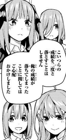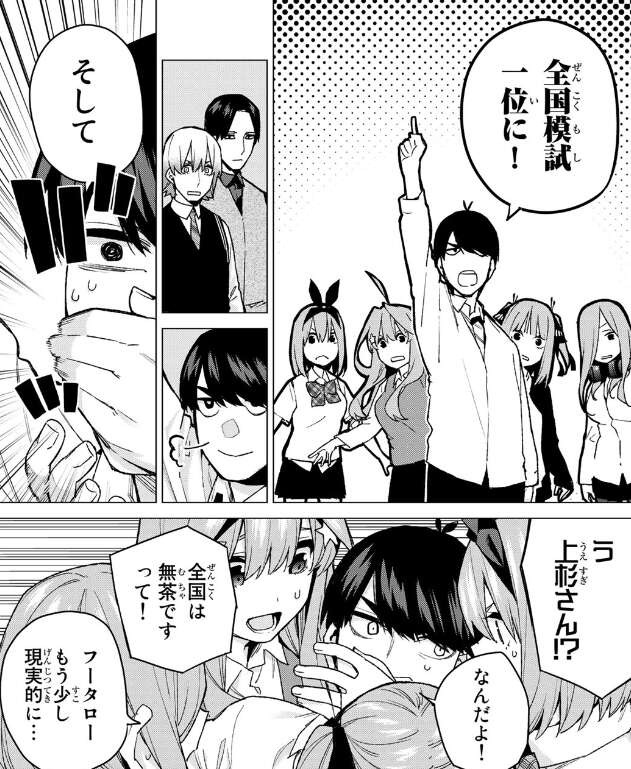 また風太郎は五つ子たちの成績を二度と落とすことはしません、武田に勝って再び学年一位に、そして全国模試一位になるとまで言い出します。さすがに全国模試一位は無茶で、現実的ではないので二乃達に強引に止められます。