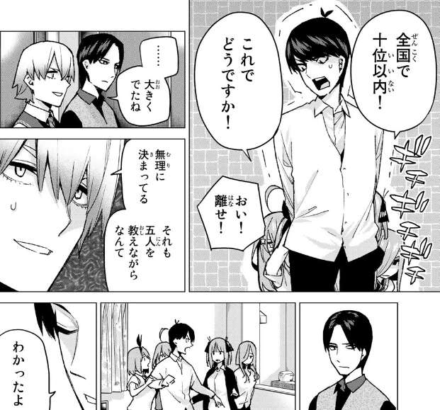 二乃達に手を拘束されて、風太郎は全国模試十位以内と条件に強引に変更されてしまいますが、父親もそのノルマがクリアできれば、娘たちに相応しいと認めてくれることになり、風太郎は全国模試十位以内という条件を、家庭教師を続けながら目指すことになります。