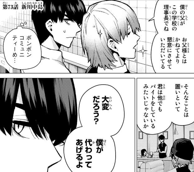 前回、唐突に武田から家庭教師交代の提案を告げられ、詳しく話を聞くと五つ子の父親と知り合いで風太郎が家庭教師をやっている事情を知っていたそうです。また風太郎のバイト先も知っていて、バイトを掛け持ちしていることも知っているようで、家庭教師を代わってあげるよと言ってきます。
