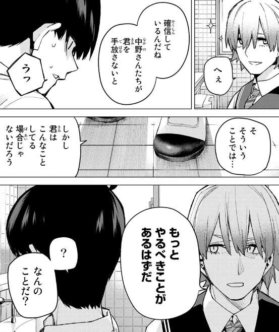 決めるのは自分ではないと言う風太郎に、武田は五つ子が風太郎を手放さないと確信しているだと言い、武田はさらに他にやるべきことがあるはずだと言います。
