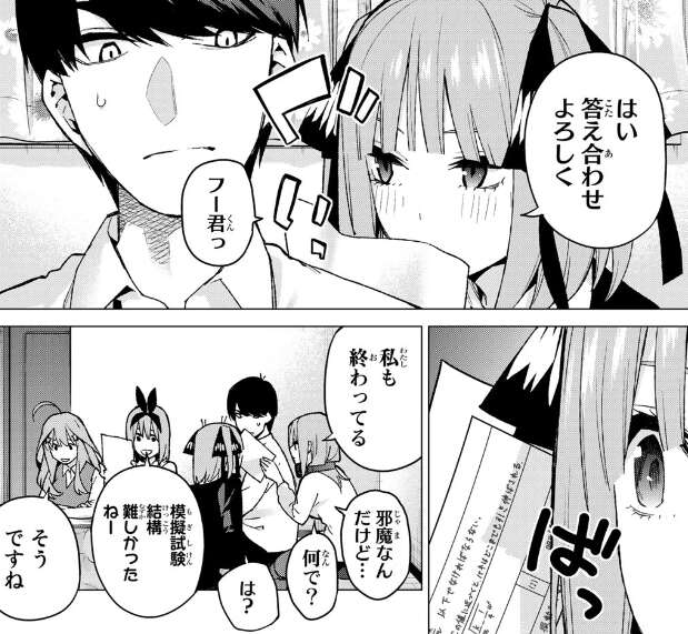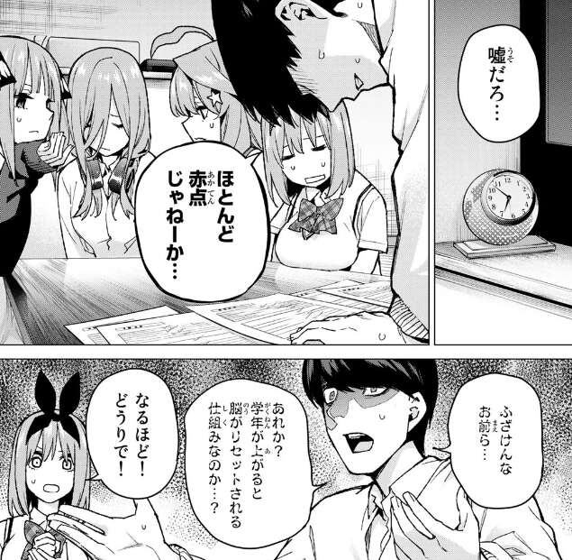 が、模擬試験の答え合わせをするとほとんど赤点ばかりで、キレる風太郎です。ここ最近バイトばかりしていたので、あまり自習できていなかったかもと反省する二乃達で、確かにバイトをまだしていない五月は点が下がっていません。二乃達は申し訳なさそうな顔をしますが、風太郎の「間違えた個所を順番に確認していくぞ」という優しい言葉に、やる気を取り戻し、勉強を再開します。