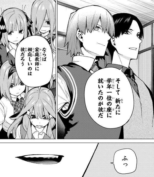 五つ子たちの父親は風太郎が優秀な同級生に教わるという事で、一定の効果を生むと教えてくれたと風太郎を評価しますが、それは未だ優秀ならの話だと言い、風太郎はどの科目も点数を落として順位を落としている事を指摘します。そして新たに学年一位の座に就いた武田が家庭教師に相応しいと言います。