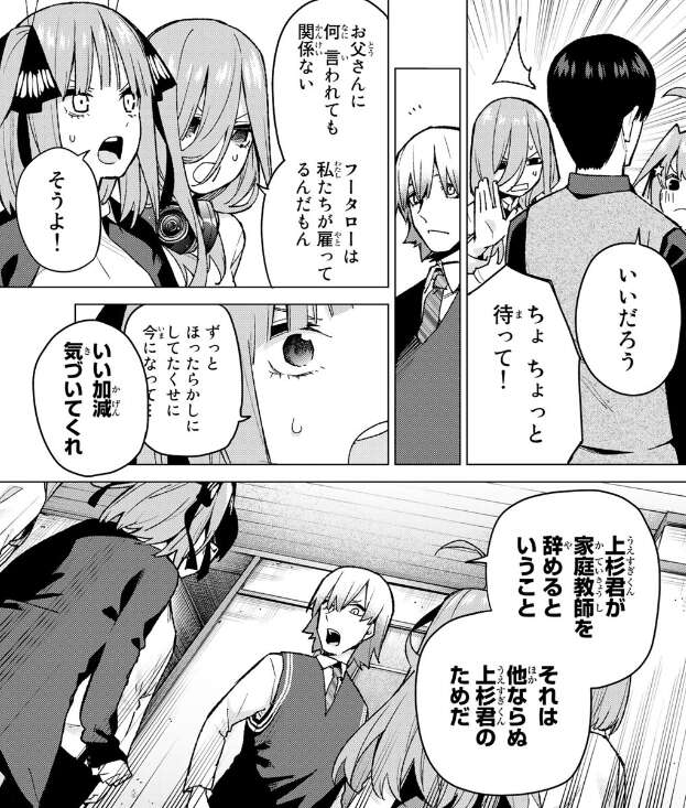 二乃達は父親の提案を断ろうとしますが、武田から風太郎が家庭教師を辞めるという事は、他ならぬ風太郎自身のためだと言い、五つ子たちが風太郎を凡人にしたと断言します。父親にも風太郎には彼の人生があるから解放してあげたらどうだい?と言われ、何も言い返せないでいます。