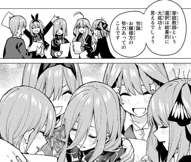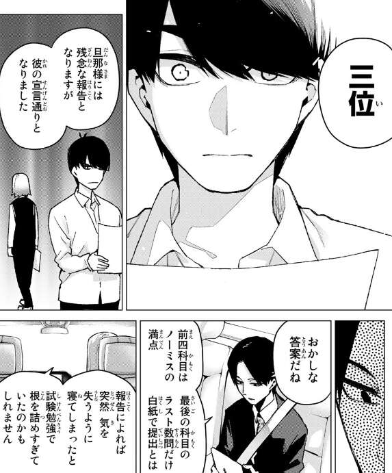そして風太郎と五つ子たちも試験結果、全国一〇位以内と赤点回避でノルマ達成です。五つ子たちの父親からの印象も、今回の件で少し良くなったように見えました。