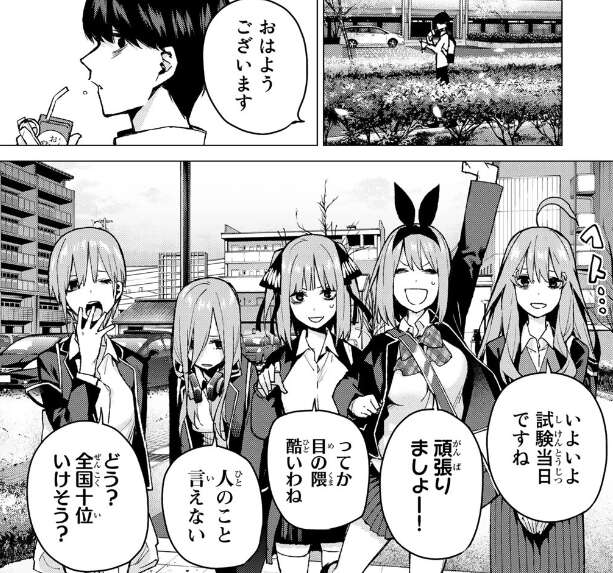 いよいよ、全国模試当日ですが、風太郎は直前まで勉強の復習をしていて、らいはに促されてやっと登校します。睡眠もろくにとっていないようで、目の隈がひどいです。