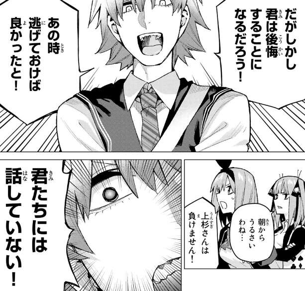 全国模試での風太郎との一騎打ちが楽しみなのか、敵対心むき出しで二乃や四葉の発言にも、かなり大声で返しています。武田が風太郎に話しかけようとしますが、風太郎は武田にはあまり構わず、五つ子たちにも早く教室に行って少しでも勉強して、悪あがきするように言います。