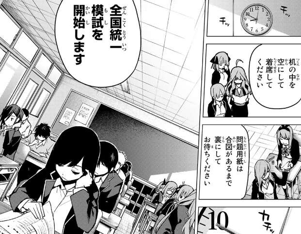 そして全国模試が始まります。風太郎は全国10位以内、五つ子たちは全員赤点回避が必須です。が、風太郎はかなり体調が悪いようでひどい顔色をしています。