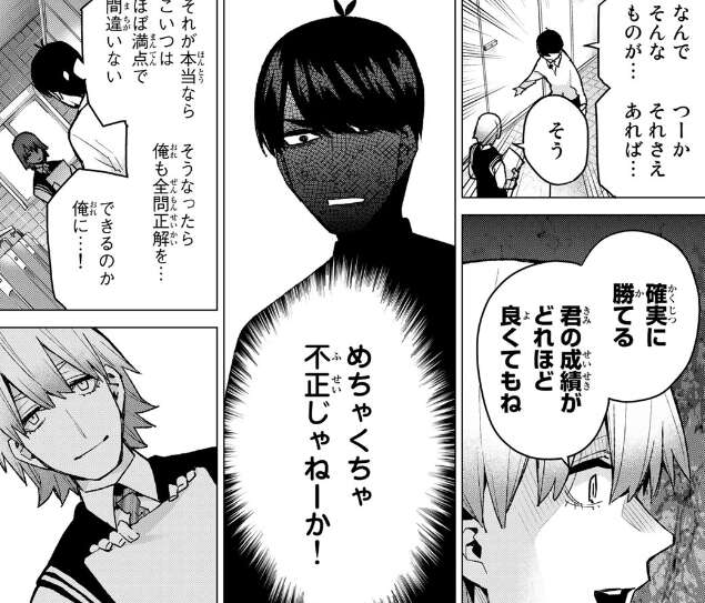 やっとトイレの個室から出てくると、やはり前と同様武田は個室の出口で待っていました。武田はこの模試の答えを手に入れたので、風太郎には確実に勝てると宣言します。父親から渡された封筒は、模試の模範回答でした。めちゃくちゃ不正だと心の中で突っ込む風太郎ですが、このままだと武田が全問正解、満点になると焦ります。
