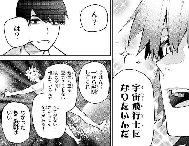 が、武田は模範解答の用紙を見ることなく、封筒ごと破りトイレに捨てます。そして自分の夢、宇宙飛行士になりたいという夢を突然語り始めます。あっけにとられている風太郎に、武田は自分には宇宙飛行士という夢があるから、誰にも負けるわけにはいけないと理由を語ります。
