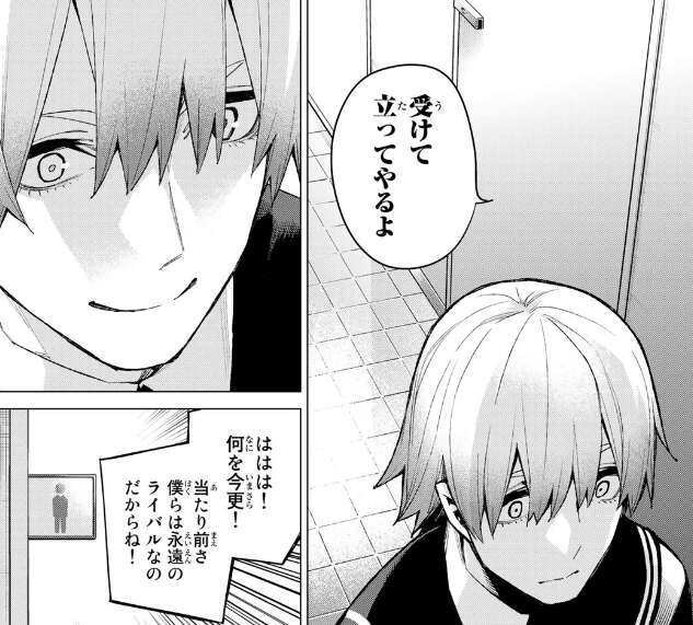 そして風太郎に実力で君を倒す!不正して得た結果なんて何の意味も持たない!と宣言します。直後、風太郎の腹の調子が悪くなり再び個室にこもってしまいますが、風太郎も武田に受けて立つと宣言します。