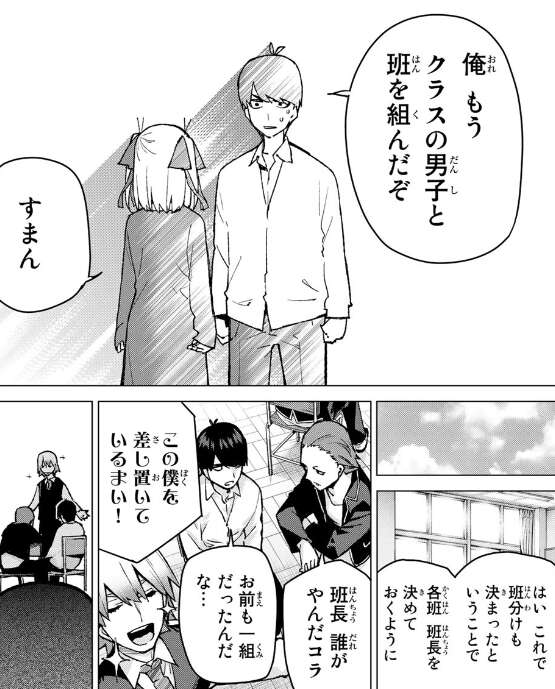 二乃は一方的に決定しますが、再度風太郎が割って入ってきて、自分の話を聞くように言います。そして風太郎は、自分はもうクラスの男子と班を組んだ事実を伝えます。風太郎は二乃にすまんと謝罪します。場面変わって、風太郎は前田、武田と班の班長を誰にするか話していますが、それをむすっとした顔の二乃が見ています。
