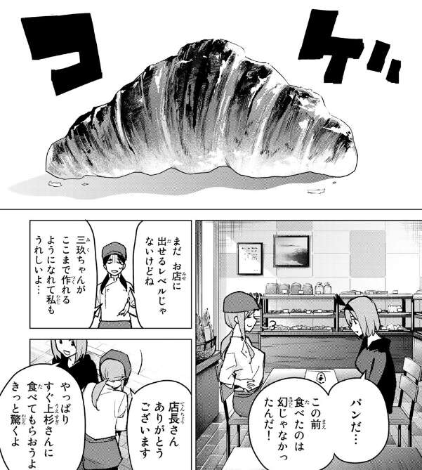 三玖がパン屋さんでバイトを始め、先週は四葉においしいと言ってもらえるまでなりましたが、そこに至るまでの成長の記録です。最初、石のようなパンを作ってしまいます。