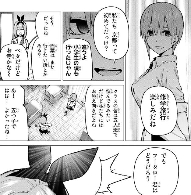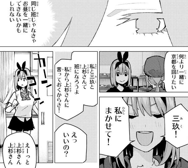修学旅行の一日目、お昼が自由昼食のはずなので、三玖はそこで風太郎に披露する予定です。場面変わって、教室ですが修学旅行の準備も本格化し、班決めを行います。一花、二乃、三玖は風太郎と同じ班になろうと考えていますが、四葉はパン屋で三玖が一緒に京都を回りたいと言っていたので、風太郎にお願いするつもりです。