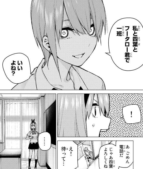 三玖は誰かが話を振る前に、風太郎に誰と班を組むか聞きます。が、すかさず一花は四葉が話したいことがあると言い、四葉を見ます。一花と三玖から頼まれてしまっていますが、断れない性格の四葉はどう話していいか悩みます。