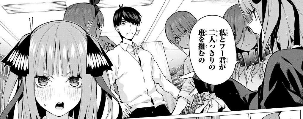 そして一花は風太郎の為だと言い、一花と四葉と風太郎で一班を作ろうと言います。二乃、三玖を外しているような気がします。この後の勉強会がある図書室に向かいながら、悩む四葉です。さらに勉強会には久々に三玖も参加し、全国模試以来全員集合します。その場で三玖は勉強を始める前に、修学旅行の話がしたいと言います。