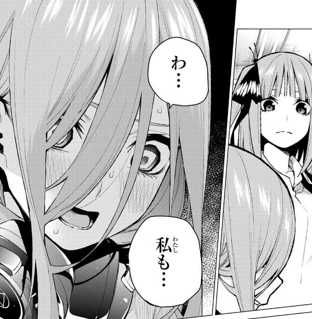 五月は二乃が堂々と好き宣言したことで、風太郎が言った前回のモテ期発言が嘘でなかったこと、そして一花も好きなのだと分かり驚きます。一方、風太郎は二乃を止めようとしますが、二乃から黙っているように言われます。そこに三玖も風太郎と「フー君」呼びして、私も…と勇気を振り絞って言おうとします。