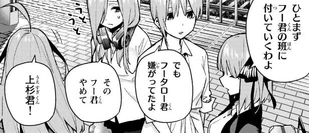 四葉は気を取り直して後悔のない修学旅行にしようと言いますが、風太郎とらいはの会話で写真の子にも会えるかもしれないしねと内容を聞き気になり始めます。四葉は写真の子って何ですかと聞きますが風太郎が回答を濁すと、四葉は途端に風太郎を問い詰めます。