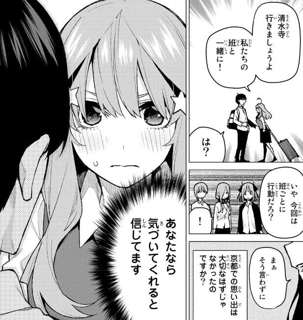 五月は風太郎に清水寺に自分たちの班と一緒に行くように、強引に誘って風太郎に零奈との思い出が大切だったことを気づかせようとさせます。驚く一花、二乃、三玖、そして四葉は五月までが風太郎にアピールし始めて、もう訳が分からなくなります。